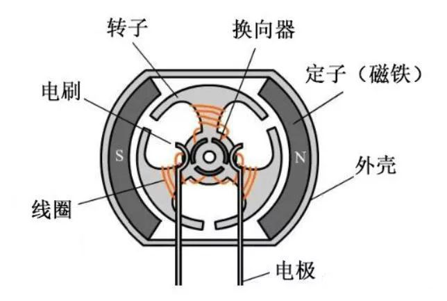 有刷電機的主要結構就是定子+轉子+電刷,通過旋轉磁場獲得轉動力矩,從而輸出動能。電刷與換向器不斷接觸摩擦,在轉動中起到導電和換相作用。